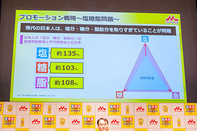At the outset, Executive Officer Hiroki Takamizawa explained that while the yogurt market is growing steadily, functional products are seeing particularly strong growth. He stated the new products are being launched to expand this emerging market. He also presented findings from a survey on Japanese dietary habits, noting that while many people are mindful of excessive salt, sugar, and fat intake, few manage to address all three in a single meal.