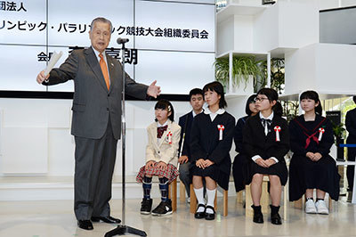 At the outset, Chairman Yoshiro Mori addressed the children: "I want to express my gratitude for the large number of entries. Each one was a wonderful piece of work. We will utilize them in various ways going forward, but please continue to take an even greater interest in the Games and cheer them on."