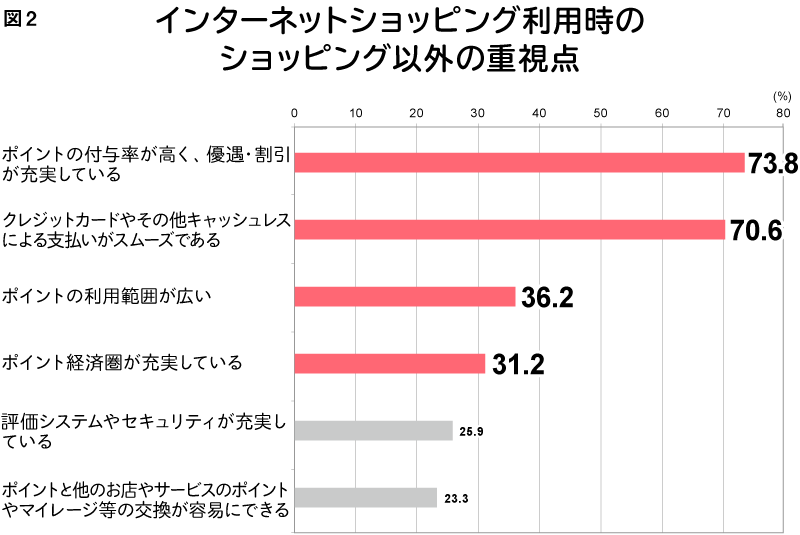 When shopping online, the most important factor beyond the shopping experience itself is "high point accrual rate" (73.8%), followed by "smooth cashless payments via credit cards, etc." (70.6%), "wide range of point usage" (36.2%), and "robust point economy" (31.2%).