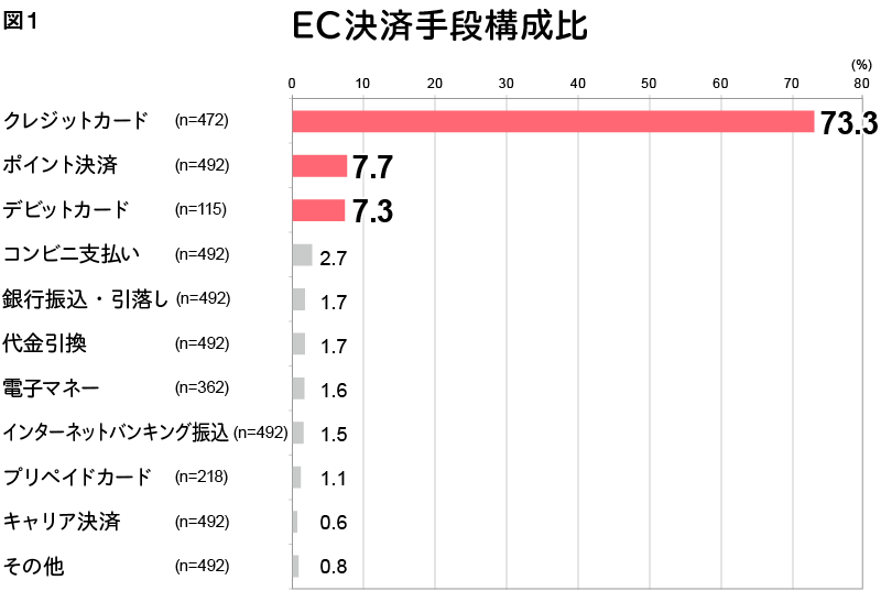 The rapid rise in cashless payment ratios is thought to be influenced by the rise of e-commerce (EC) and its payment methods. If the total EC payment methods are considered 100%, credit card payments account for 73.3%, point payments for 7.7%, and debit card payments for 7.3%, making up the top positions.