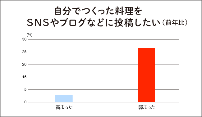 Graph 1 is excerpted from the "Food Lifestyle Lab Survey Vol. 5" (*1), an independent internet survey conducted by Shokurabo in September 2016. It shows how the mindset of "wanting to post photos of meals I've made myself on SNS or blogs" changed compared to the previous year. Only 3.5% of respondents answered that it had "increased," while over 25% answered that it had "decreased," clearly showing a decline in the intention to post on SNS.