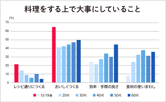 Conversely, cooking frequency increases with age. As this happens, the sense of cooking as something out of the ordinary diminishes, and a tendency to prioritize efficiency and speed emerges. Teens enjoy cooking as an event, while those in their 30s and older handle it as part of daily life.