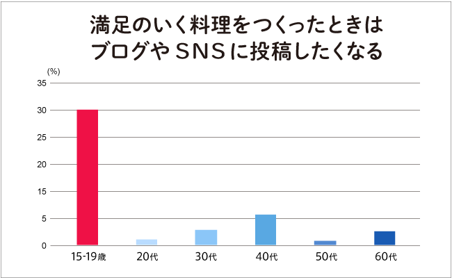 Meanwhile, Graph 2 shows the mindset "I feel like posting on blogs or SNS when I make a satisfying dish" by generation. It reveals that a certain number of teens still want to post their cooking on social media.