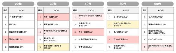 ※3 Future Certainty Survey: Calculates the score difference between responses to two questions—"Do you feel this way now?" and "Do you think you will feel this way in 5 years?"—for 58 future mindsets. This creates a ranking of "Mindsets Likely to Increase in the Future." The top 5 by age group are as follows.