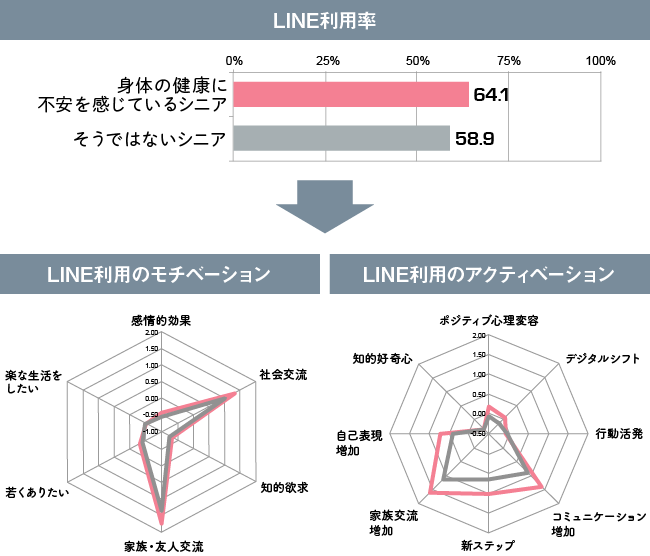 Digital technology also contributes to seniors facing challenges. Figure 2 summarizes LINE usage among seniors who "feel anxious about their physical health" (※3). Seniors with health concerns show a high LINE usage rate. Their motivation for using it strongly reflects a desire for family and friend interaction, and they report feeling that family communication has actually increased. By providing a means for constant communication with family, LINE appears to alleviate seniors' anxieties.