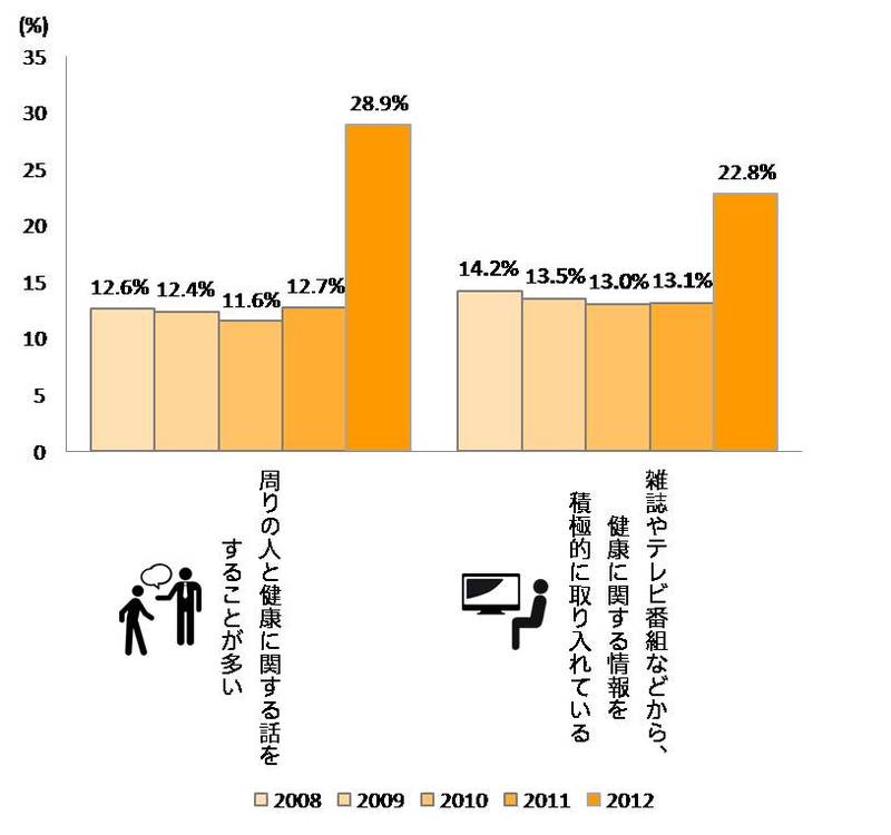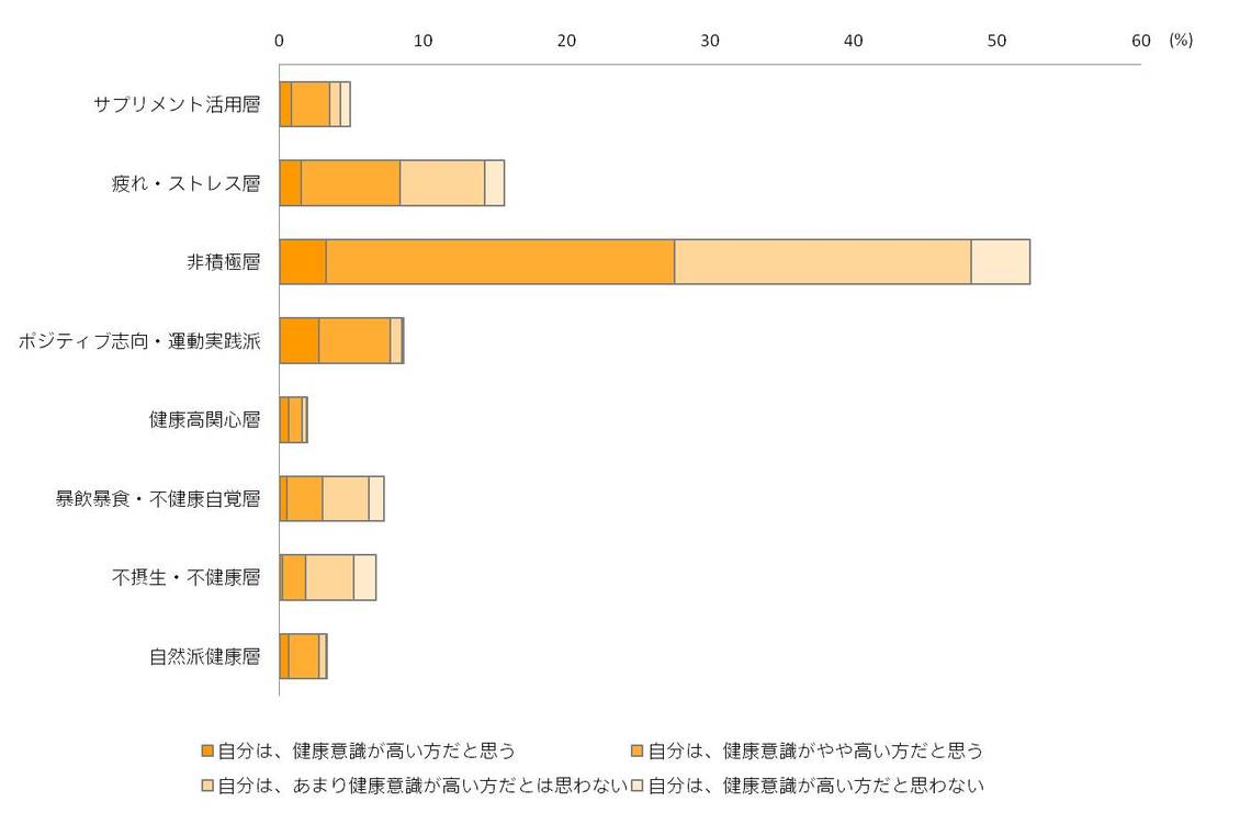 This survey categorizes its 10,000 respondents—men and women aged 20 to 60—into eight distinct clusters based on their health consciousness. Among these, the volume of the cluster we call the "non-active group" has been increasing year by year. By 2012, it finally exceeded half of the total, becoming a force that cannot be ignored in marketing.