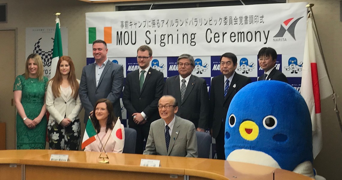 The Irish Paralympic Committee and Narita City, Chiba Prefecture, signed a memorandum of understanding at Narita City Hall on May 16 to designate the city as a pre-competition training base for the Tokyo 2020 Paralympic Games. The Committee had conducted site visits across Japan since 2017 to evaluate potential training locations. Narita was selected for its excellent access from Tokyo, combined with the city's proactive efforts to ensure barrier-free access to facilities like swimming pools and athletics stadiums.