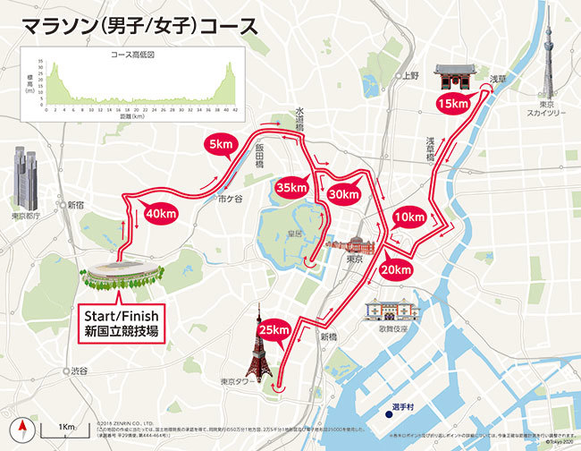 The marathon course starts and finishes at the new National Stadium, passing through Tokyo landmarks such as Asakusa's Kaminarimon Gate, Nihonbashi, Ginza, Zojoji Temple, and Tokyo Tower.