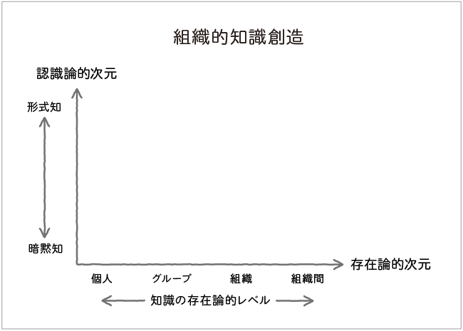 "Individual and organization" and "explicit and tacit knowledge." The concept is that the interaction along these two axes generates ideas and becomes the driving force for innovation.