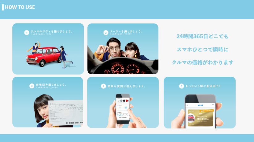 The app enables users to smoothly complete the entire process from appraisal to sale, anytime, anywhere, 24/7, using their smartphone. Simply launch the app, take photos of the vehicle body, odometer, and vehicle registration certificate with your smartphone camera, answer a few simple questions, and you'll immediately receive an appraisal amount.