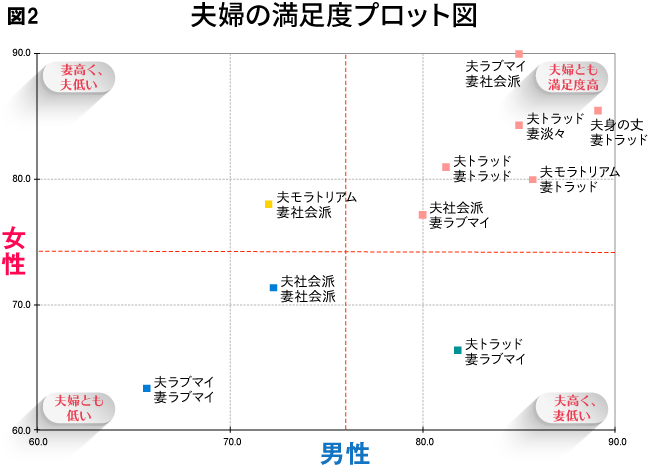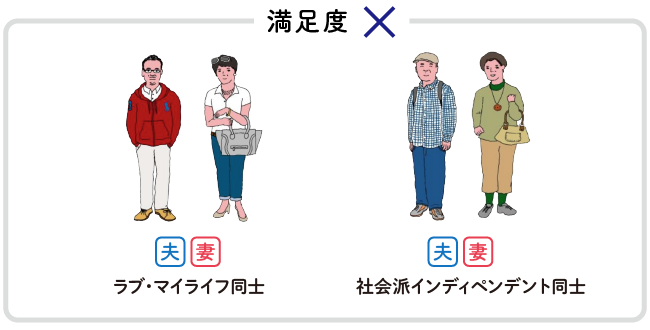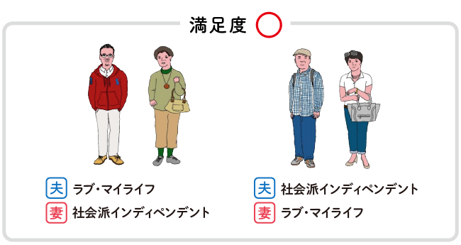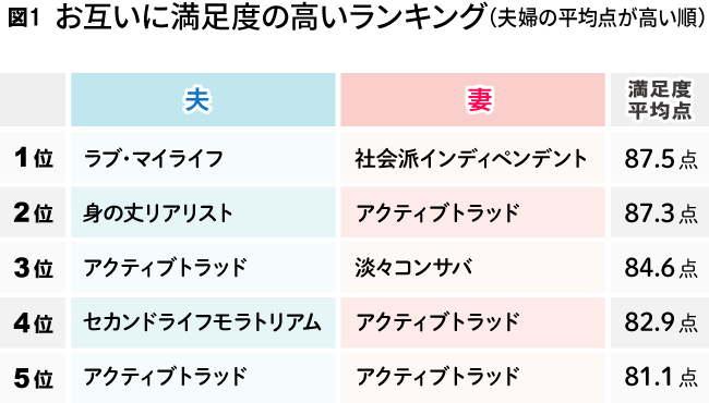 The result showed that the highest satisfaction was found among "Husband: Love My Life / Wife: Socially-Minded Independent" couples. While the overall average score was 73.9 points, they scored a remarkably high 87.5 points.