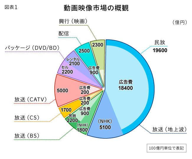 Broadly, it is divided into "Broadcasting" (terrestrial, BS, CS, CATV), "Packaged Media (DVD/BD)" (rental, retail), "Streaming," and "Theatrical (Movies)." Among these, terrestrial broadcasting stands out, accounting for over half of the total. Notably, commercial broadcasters are largely supported by advertising revenue, allowing viewers to watch for free.