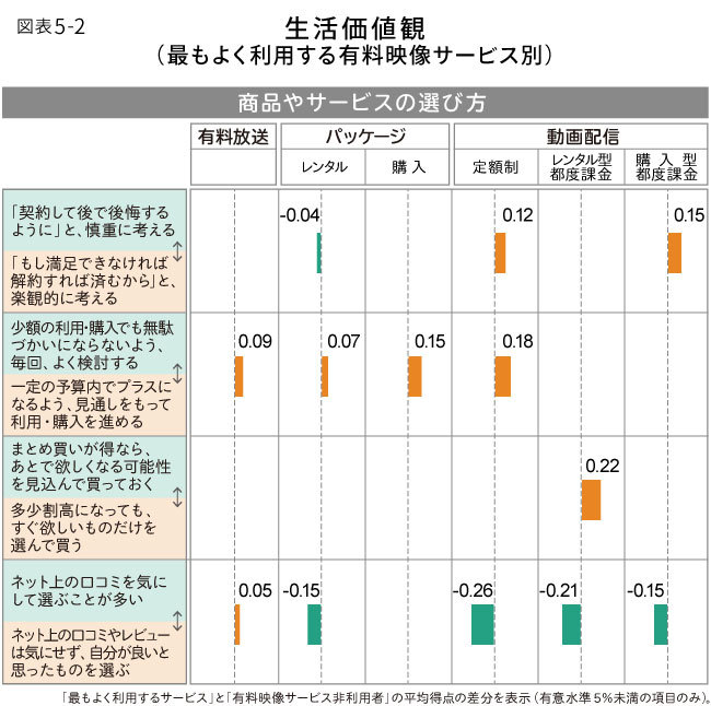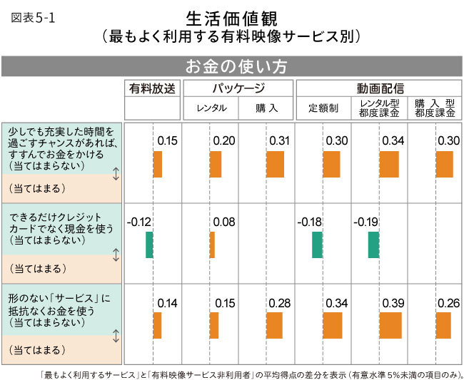 Paid video users may subscribe to multiple service categories. Therefore, users were classified based on their response to "the service category they use most frequently," allowing us to examine the distinctive values observed among users of each category.