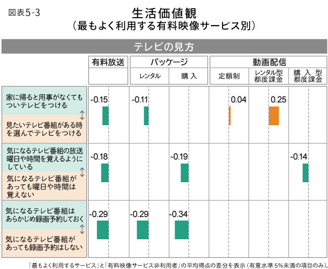 Furthermore, users of "pay TV" and "DVD/Blu-ray rentals" were more likely to say "I tend to turn on the TV when I get home, even if I have no particular reason to." Conversely, the tendency to say "I only turn on the TV when there's a specific program I want to watch" was strongly expressed by users of "video streaming."