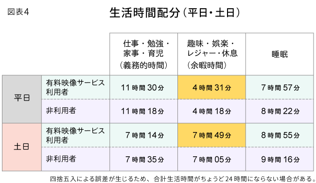 First, focus on the shaded portion representing leisure time. Paid video service users have longer leisure time than non-users on both weekdays and weekends. The difference is particularly significant on weekends, exceeding 40 minutes. While not all leisure time is spent on paid video services, users seem to have created the temporal flexibility necessary as a "prerequisite" for viewing.