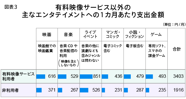 Furthermore, we examined how much users spend on entertainment beyond the six paid video service categories: movie theater visits, music (CDs/streaming), live events, manga/comics, novels/fiction, and games (dedicated software/mobile in-app purchases). The total monthly expenditure across these six categories showed an average of approximately ¥3,400 for video service users and approximately ¥1,900 for non-users, revealing a gap of about ¥1,500. This suggests that being proactive in overall entertainment spending is one factor contributing to the willingness to pay for video services.