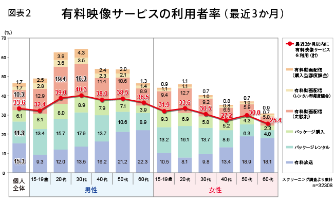 The line graph shows the percentage of individuals who used any of the six paid video services within the last three months, excluding multiple responses. Looking at the far left column for all individuals, 33.6% of all individuals aged 15-69 (both men and women) used at least one of the six services, meaning roughly one in three people fall into this category. The breakdown shows paid broadcasting services were the most popular at 15.3%, followed by package rentals (so-called rental videos) at 11.3%, and subscription-based paid video streaming at 10.3%.