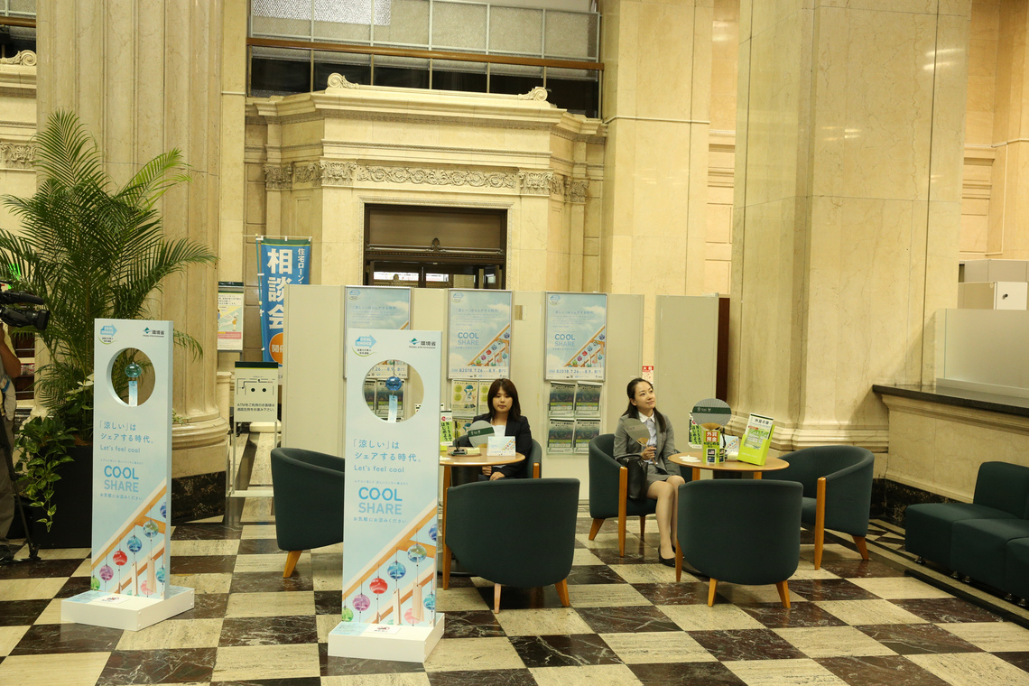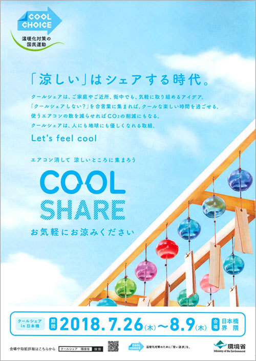 The Ministry of the Environment is taking a step beyond "Cool Biz" by promoting "Cool Share," which encourages rethinking air conditioner usage and sharing coolness.