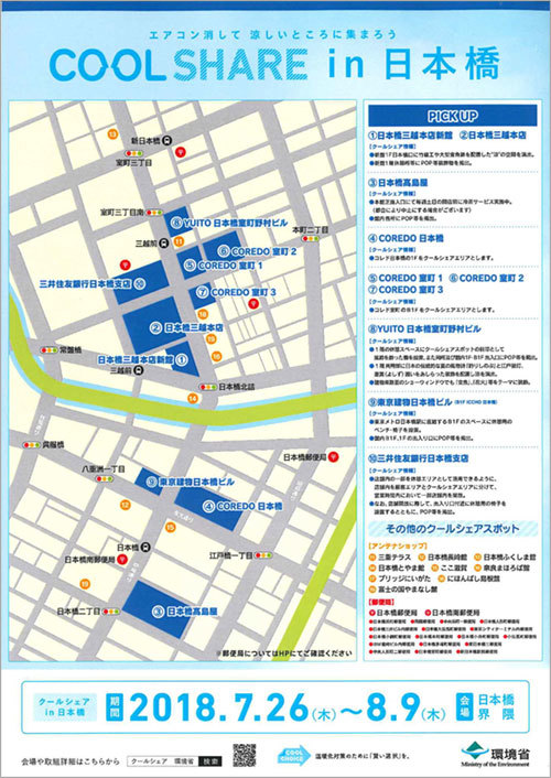 The Ministry of Economy, Trade and Industry (METI) implemented a regional model project called "Cool Share in Nihonbashi" in Tokyo's Chuo Ward Nihonbashi area from July 26 to August 9. This project involved a wide range of participants, including mixed-use facilities housing offices and restaurants, post offices, and major banks. Participating facilities increased to 39, about five times the previous number. Posters and stickers promoting Cool Share were distributed to highlight spaces and streets where people could "casually cool off."