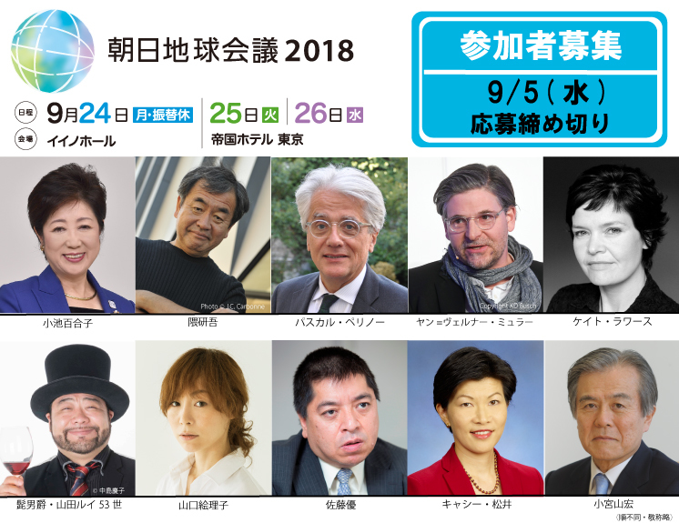 The Asahi Shimbun will hold the international symposium "Asahi Global Forum 2018" to discuss solutions for global social issues on September 24 at Iino Hall in Chiyoda Ward, Tokyo, and on the 25th and 26th at The Imperial Hotel Tokyo.