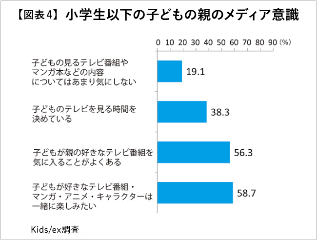To confirm this background, we examined awareness data from parents with children, also sourced from "Kids/ex" (Figure 4). Approximately 40% of parents "set limits on their child's TV viewing time," while only about 20% "don't pay attention to the content their child watches." This suggests parents are actively involved in their children's TV viewing.