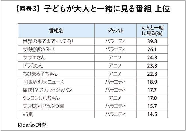 Next, let's examine what types of programs are watched together by parents and children, based on the "Kids/ex" survey targeting children in elementary school and younger (Figure 3). In the 2017 survey, variety shows and anime ranked highest among programs children watch with their parents. The top two programs, "Itte Q! to the Ends of the World!" and "The! Iron Arm! DASH!!", feature celebrities introducing various information from overseas and within Japan, or taking on diverse challenges. These are variety shows enjoyable across a wide age range, from young children to adults.