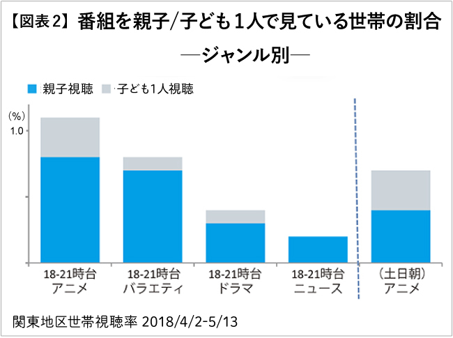 So, what types of programs are frequently watched by parents and children together? (Figure 2) Looking at programs aired from evening to night, while the proportion of parent-child viewing is relatively low overall, anime shows a comparatively higher share. Although many anime are made for children, it's clear that the proportion watched "by parents and children together" is higher than that watched "by children alone."