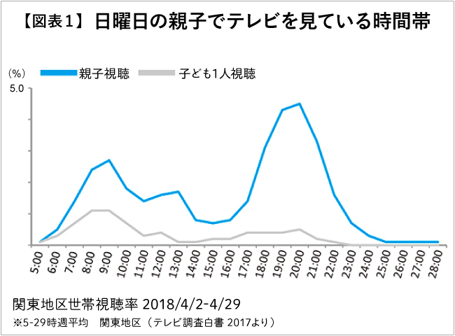 First, looking at when parent-child viewing peaks, we examined Sundays when families are most likely home. Parent-child viewing exceeded children watching alone in every time slot (Figure 1). Parent-child viewing concentrated in the "morning" and "evening to night" periods, particularly standing out between 6:00 PM and 9:00 PM, suggesting families relax together watching TV on holiday evenings.