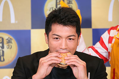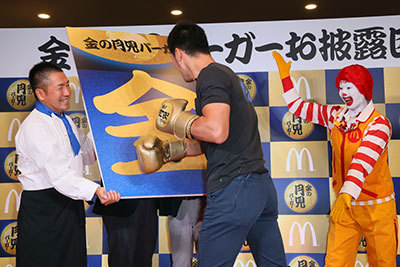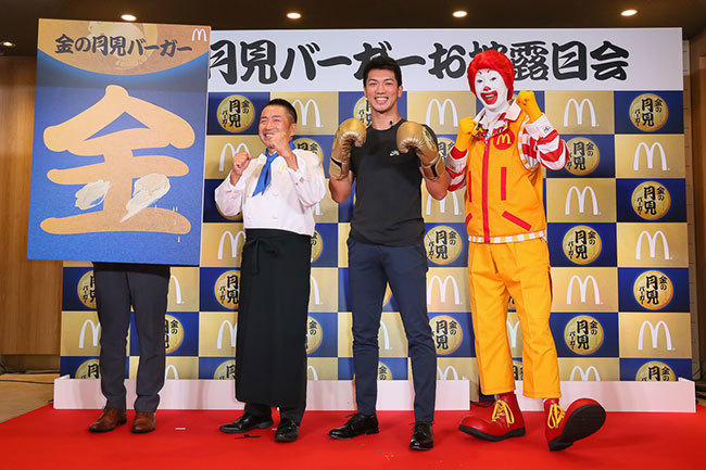 After tasting the Tsukimi Burger, Murata offered a boxer-like comment: "Undeniably delicious. Food this tasty is the enemy of weight loss." He then picked up the Golden Tsukimi Burger, delivering a professional-level food review: "This melt-in-your-mouth texture looks delicious already. I'm also looking forward to the fluffy bun." He praised it, saying, "The Tsukimi Burger is twice as delicious, but this is three times as delicious. The melted cheese pairs perfectly. It's so rich it makes me worry about my upcoming training." Senior Manager Shigeaki Wakana of the Menu Management Department beamed, replying, "That's a gem of a comment."