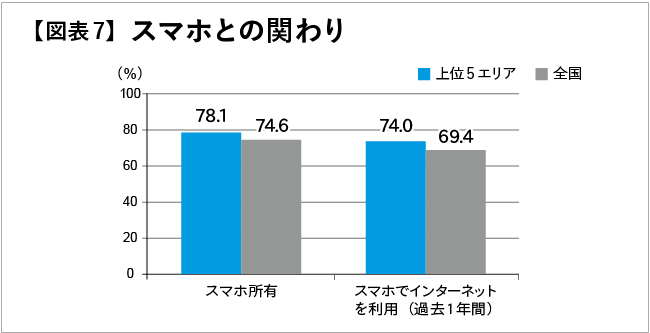 Looking at the top five areas with the highest smartphone listening rates (Tokyo, Kanagawa, Nara Prefecture, Osaka Prefecture, Fukuoka Prefecture grouped together). Regarding smartphone usage in these top five areas, smartphone ownership stands at 78.1%, slightly higher than the national average of 74.6%. Similarly, internet usage via smartphone in the past year was 74.0% in the top five areas, compared to 69.4% nationally (Figure 7).