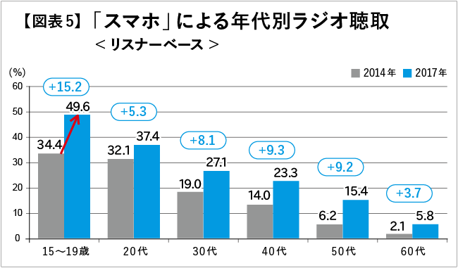 First, examining the 2017 data by age group reveals that smartphone radio listening is highest among 15-19 year-olds at 49.6%, meaning nearly half of listeners in this group listen via smartphone (Figure 5). Next were those in their 20s at 37.4% and those in their 30s at 27.1%. Currently, smartphone listening appears more prevalent among younger generations. Compared to 2014, the highest increase was among 15-19 year olds, up 15.2 percentage points. Those in their 30s to 50s also saw increases of around 8-9 points.