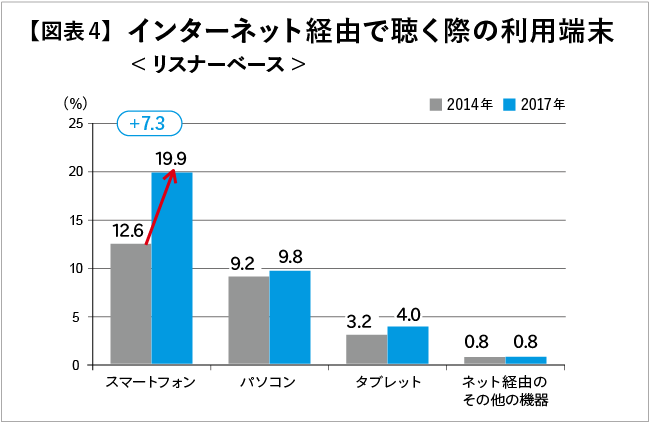 Among these, listening via "smartphones" (hereafter "smartphones") shows a particularly high rate of increase. The 2017 results show a listener base* of 19.9%, a 7.3-point increase compared to 2014, indicating that the habit of listening via smartphones is gradually becoming established.