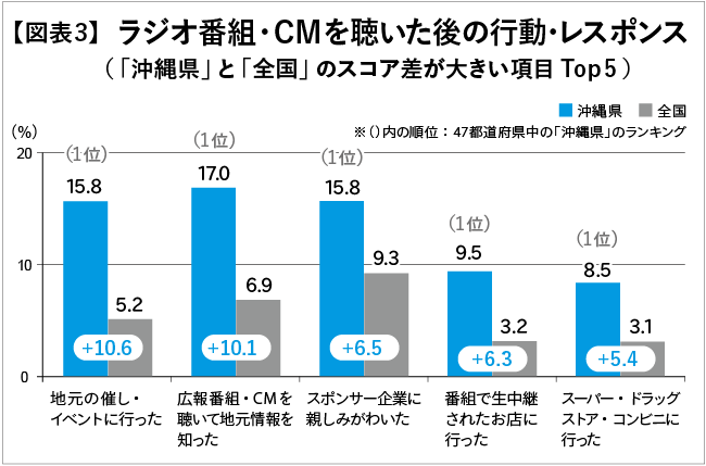 Furthermore, this evaluation translates into "actions/responses" after listening to radio (Figure 3). The percentage of listeners who took action based on "local information" gained from radio—such as "attending local events" or "visiting a shop featured live on a program"—was 5 to 11 points higher in Okinawa Prefecture compared to the national average.