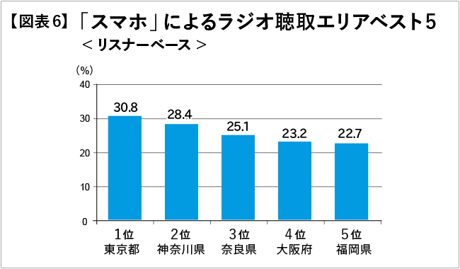 Looking at regional breakdowns, Tokyo has the highest smartphone listening rate at 30.8%. Following are Kanagawa Prefecture at 28.4%, Nara Prefecture at 25.1%, Osaka Prefecture at 23.2%, and Fukuoka Prefecture at 22.7%, showing urban areas dominate the top rankings (Figure 6).