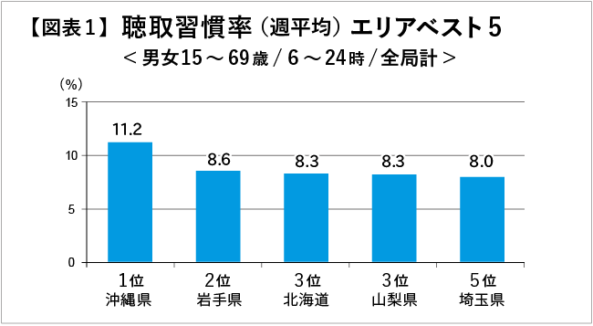 Once again, "Okinawa Prefecture" ranked highest in radio listening this year. Following in second place were "Iwate Prefecture" (previously 3rd), "Hokkaido" (previously 9th), "Yamanashi Prefecture" (previously 4th), and "Saitama Prefecture" (previously 18th). Excluding Okinawa, the listening rates for these four prefectures were very close, showing nearly identical levels (Figure 1). Okinawa Prefecture has ranked first for five consecutive years since the survey began, while Iwate Prefecture has ranked second for four out of the five years (excluding last year). This clearly shows that these two prefectures have a high number of people who habitually listen to radio.
