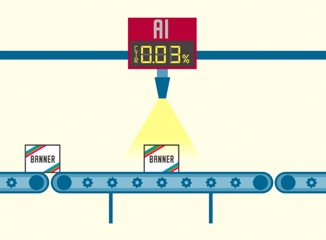 The first AI thinks about what kind of banner is needed instead of a human. Banner ads consist of creative elements like text, image assets, layout, and color. This AI learns the relationship between these creative elements and CTR (click-through rate) from past data. Based on the input orientation, it suggests suitable creative element candidates. Deep learning is used for this learning process.