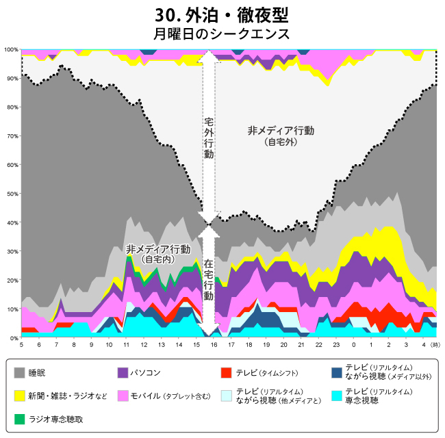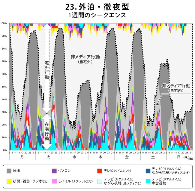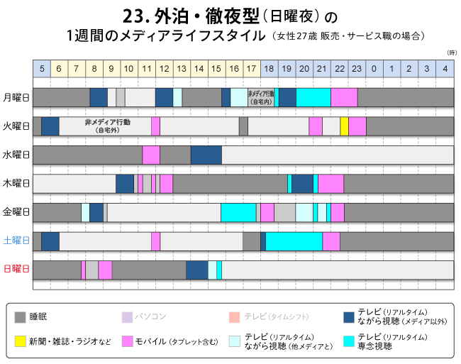 This time, let's shift our focus slightly and examine the weekly media lifestyle of those in "23. Overnight Stay & All-Nighter Type (Sunday Night)".