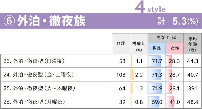 The four styles of the "⑥ Overnight Stayers/All-Nighters" share the commonality of having several nights a week when they do not return home, but the specific days of the week differ for each style.