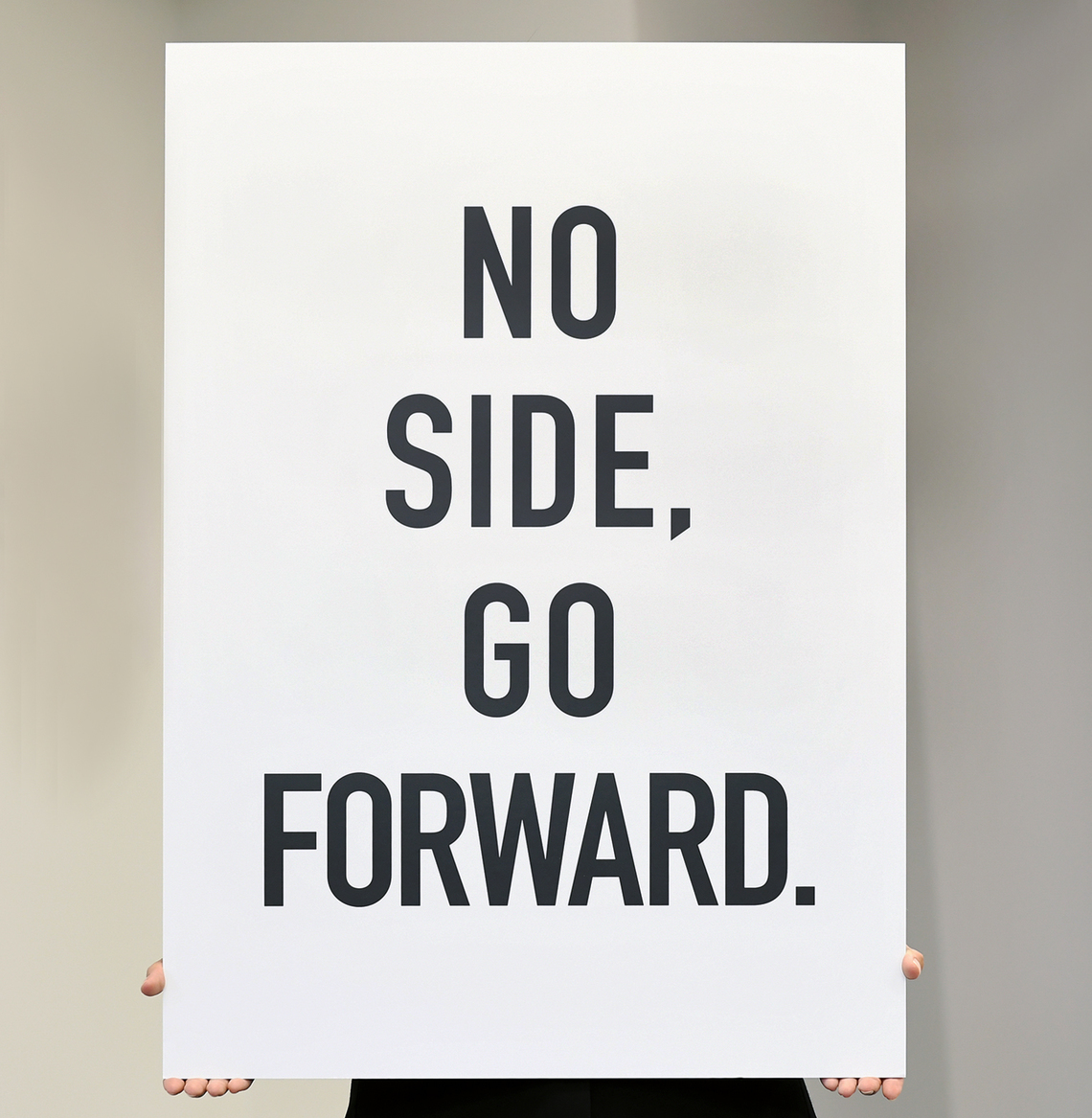 The slogan "NO SIDE. GO FORWARD." calls for taking a step toward a society where all people can "see, hear, and engage with the world from the same perspective," a society "where people take mutual interest rather than make concessions," and a society "where people can build their own future through their own efforts, rather than just participating in a society envisioned by others."