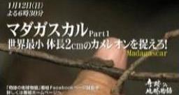 TV Asahi's science program "Miracle Earth Story" (Sundays at 6:30 PM, sponsored by Canon) will air a special Madagascar feature on January 12th to commemorate its 200th broadcast. This episode will feature the world's first ecological footage of the world's smallest chameleon, measuring approximately 2 centimeters in length.