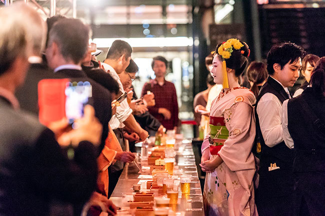 The "Sake Garden" in Okazaki Park featured Kyoto's renowned sake brands. Additionally, uniquely themed bars appeared, such as the "Schoolgirl BAR" and "Bonsang BAR," created in collaboration with Kyoto cultural figures and restaurants. The "Beer Garden" in the courtyard of ROHM Theatre Kyoto offered beer, a symbol of the Meiji Restoration, along with appetizers from renowned Kyoto cuisine establishments, with geiko and maiko adding to the ambiance. Additionally, the venue hosted mini-live performances by local Kyoto artists under the title "New Era Outdoor Concert."