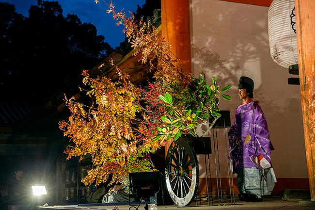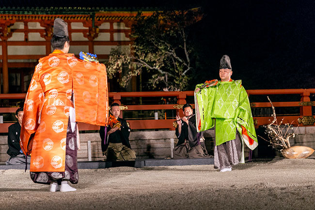 In the Heian Jingu area, a flower arrangement demonstration by Sasaki Ryufu, head of the Misei-ryu Sasaki school, was held before the Otenmon Gate. In the Shirasuna area, a Noh dance inspired by kemari (traditional Japanese ball game) was performed by Uta Ryusei, a Shite performer of the Kongo-ryu school, and others.
