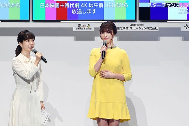 Actress Kyoko Fukada, serving as the 4K/8K promotion character, appeared at the venue in a vibrant yellow dress.