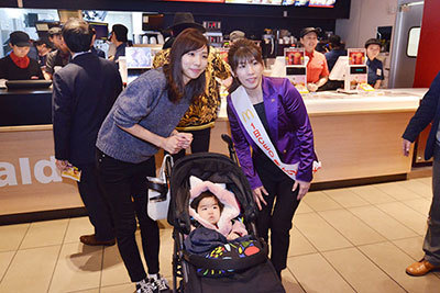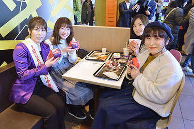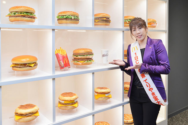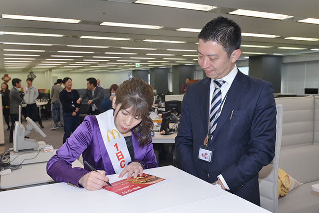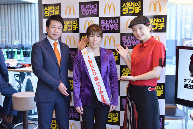 Yoshida responded, "I want McDonald's, which I love so much, to be loved even more by everyone." He energetically interacted with store crew members at the counter, recommended "Teriyaki" burgers to customers, and posed for photos.