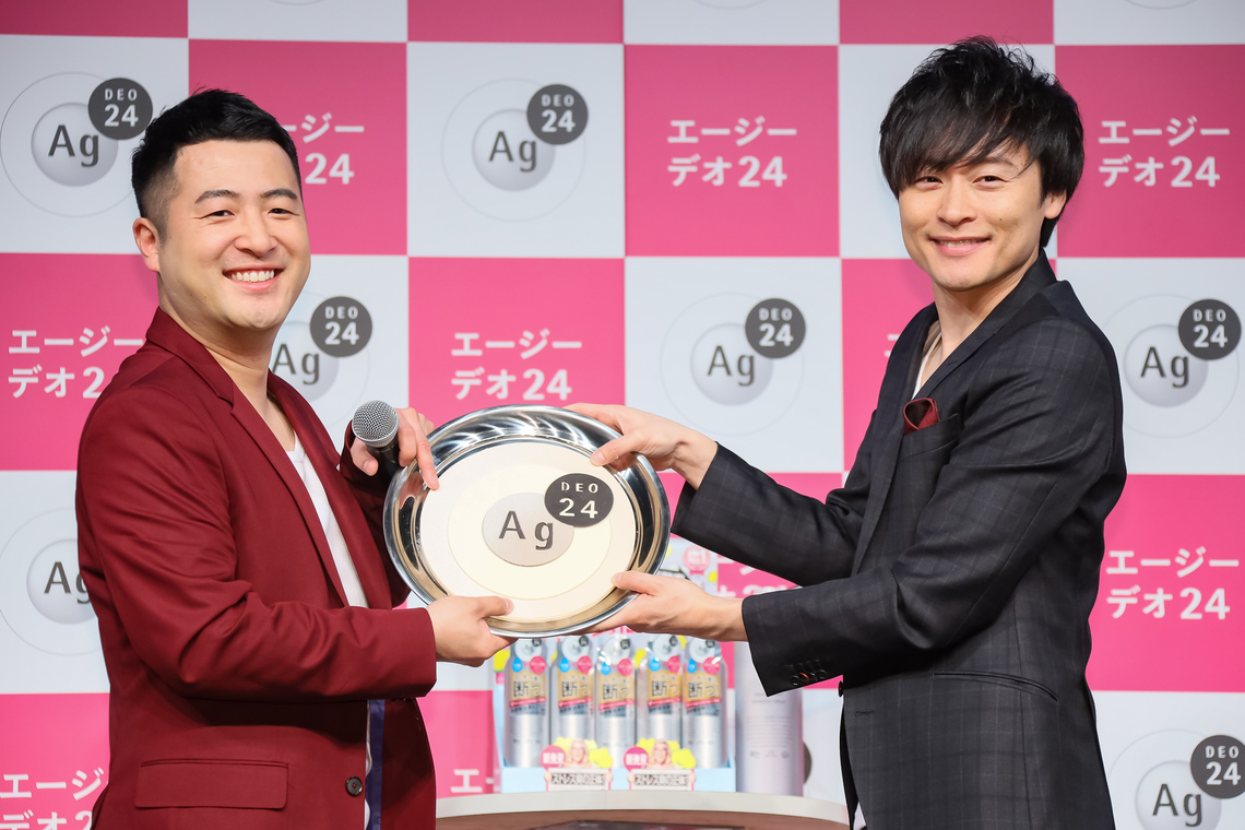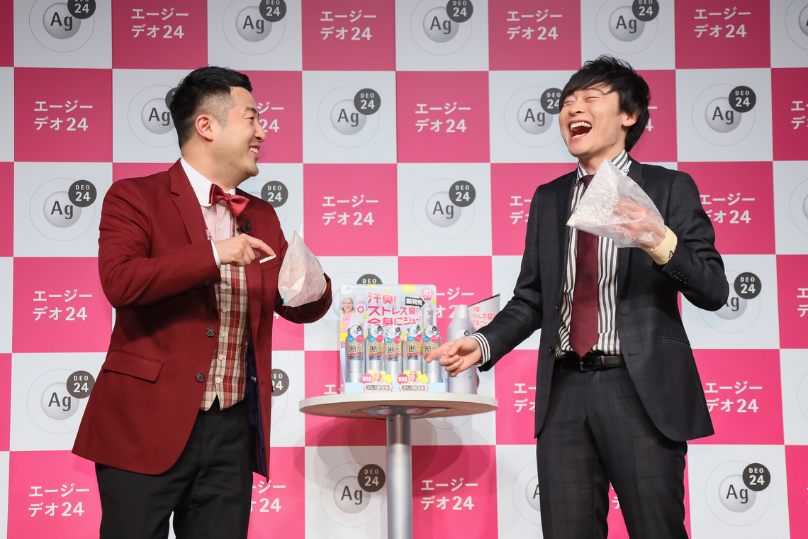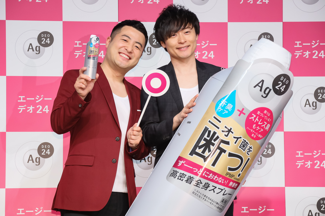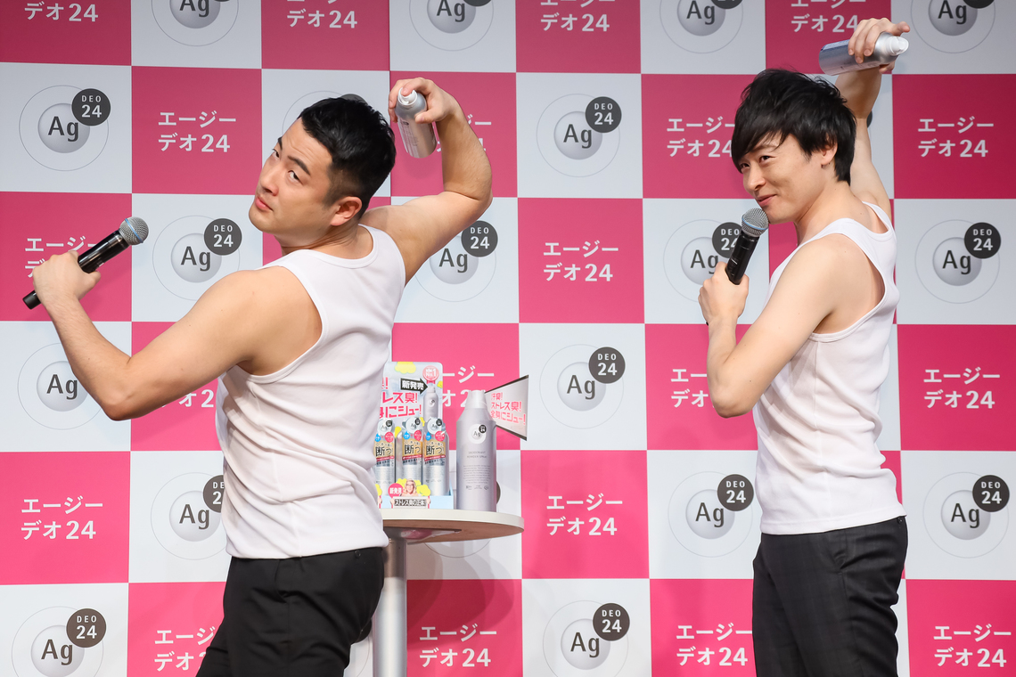 Holding an AG DEO 24 spray bottle, Mizuta remarked, "This silver color suits me, right? It's the color of a silver medal," referencing their three consecutive runner-up finishes at the M-1 Grand Prix. Kawanishi responded with a smile, "AG is number one in sales, right? Wagyu will also aim for gold next time and do our best."