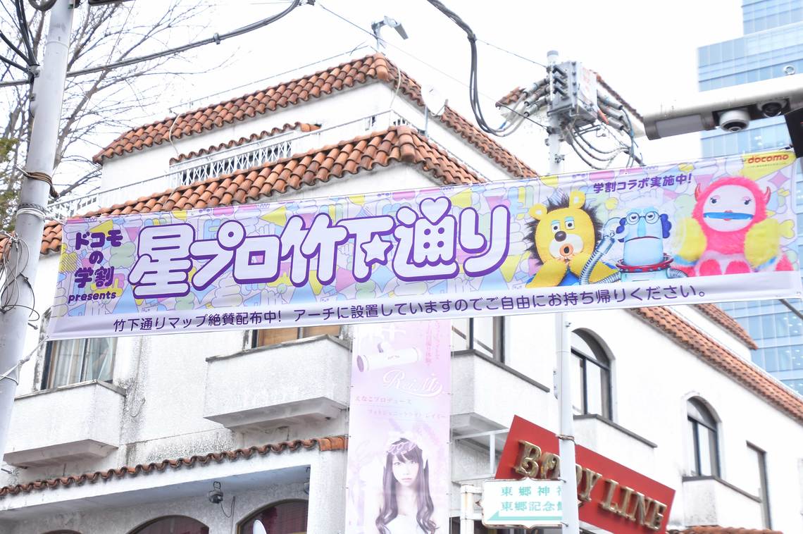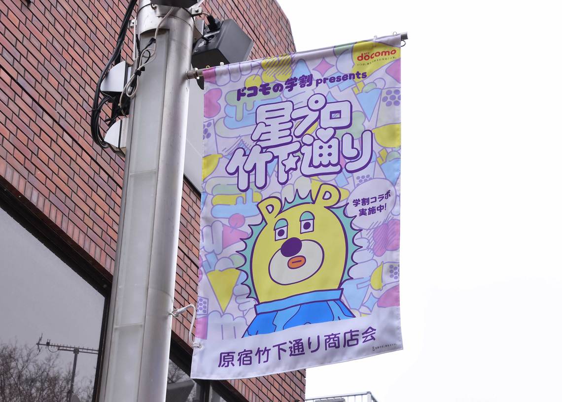 NTT DOCOMO is collaborating with Takeshita Street in Harajuku, Tokyo, to run a limited-time campaign called "DOCOMO Student Discount Presents Hoshi Pro Takeshita Street" until March 14th. This campaign recreates the setting of their currently airing TV commercial, "Right in the Middle of Youth: Takeshita Street".