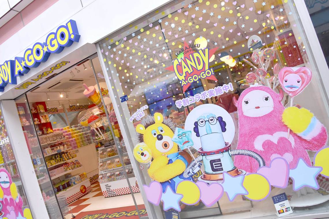 The campaign collaborates with eight representative shops along Takeshita Street, selling original goods and menu items inspired by the commercial characters Donimal, Cosmof, and Monjuro.