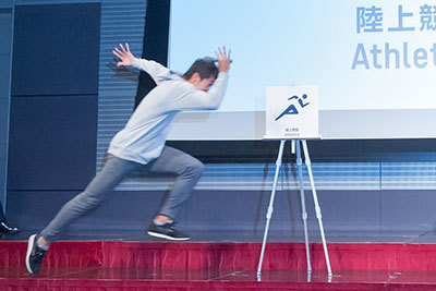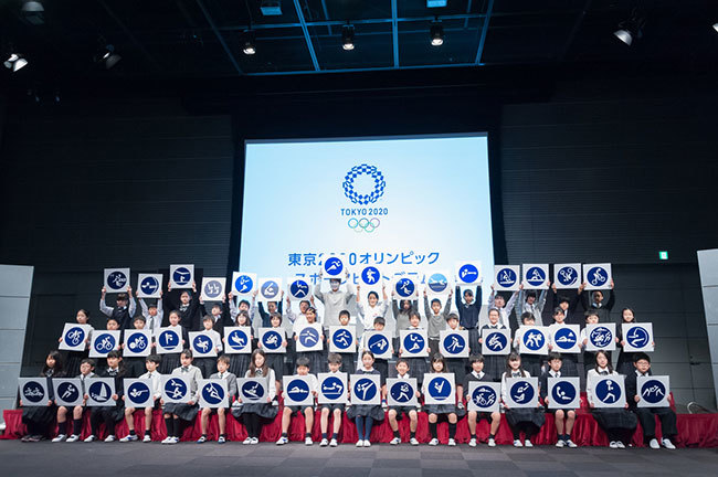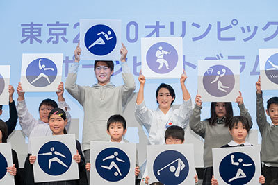 Athletes Shota Iizuka (Rio relay silver medalist) and Kiyo Shimizu (karate kata), along with students from Ariake Nishi Gakuen Elementary School in Koto Ward, took the stage. With the chant "Tokyo! 2020!", they simultaneously unveiled all 50 pictograms for the 33 sports.