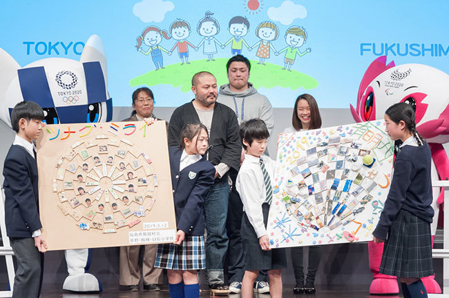 On stage, children from both schools unveiled monuments they had created. These monuments were exchanged in the presence of workshop participants including Asao Tokolo, designer of the Games emblem; Ryo Taniguchi, designer of the mascots; Olympian Takahisa Oguchi (luge); and Kaei Ito, an Olympic swimmer and member of the Organizing Committee staff.