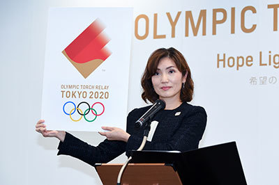 Following him, Miho Takeda (synchronized swimming medalist) of the Torch Relay Planning Committee took the stage to unveil the emblem.